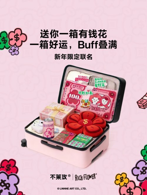 艺术为旅,祝福随行 本次联名以 “新年新出发,一路生花” 为主题,深刻洞察现代旅途中的情感需求。每一次出发,都装载着对改变的勇气、对新局的期许。不莱玫与“有钱花”以“祝福”为原点,将艺术创作转化为3款寓意不同的“旅行伴侣”,让行李箱超越装载功能,成为承载个人故事与好运期盼的移动符号。 • 金钱花:献给推开新世界之门的你 设计以粉黑撞色为底,箱面绽放璀璨金色巨花。其寓意 “新程即新运” ,用最直观的潮酷视觉,为升学、入职、开启新城市生活的年轻人,送上开门见喜的祝愿。 • 聚财花:献给正在职场进阶与开拓新项目的你 深邃黑箱体搭配神秘紫色配件,箱面铺满富有动感的彩色线条花朵。它寓意“每一次提起行囊,都离目标更近一步”,沉稳内敛而不失潮流锋芒,陪伴奋斗者在旅途中坚定前行。 • 放肆花:献给决定自主定义旅程与节奏的你 此款设计独具互动巧思。黑白底色宛如画布,其上印有元宝与花朵线稿。更特别的是,随箱附赠5支彩色马克笔,邀请使用者在旅途中即兴涂鸦、记录心情,将行李箱DIY成独一无二的个人艺术藏品,真正实现 “自定义你的Gap Time” 。