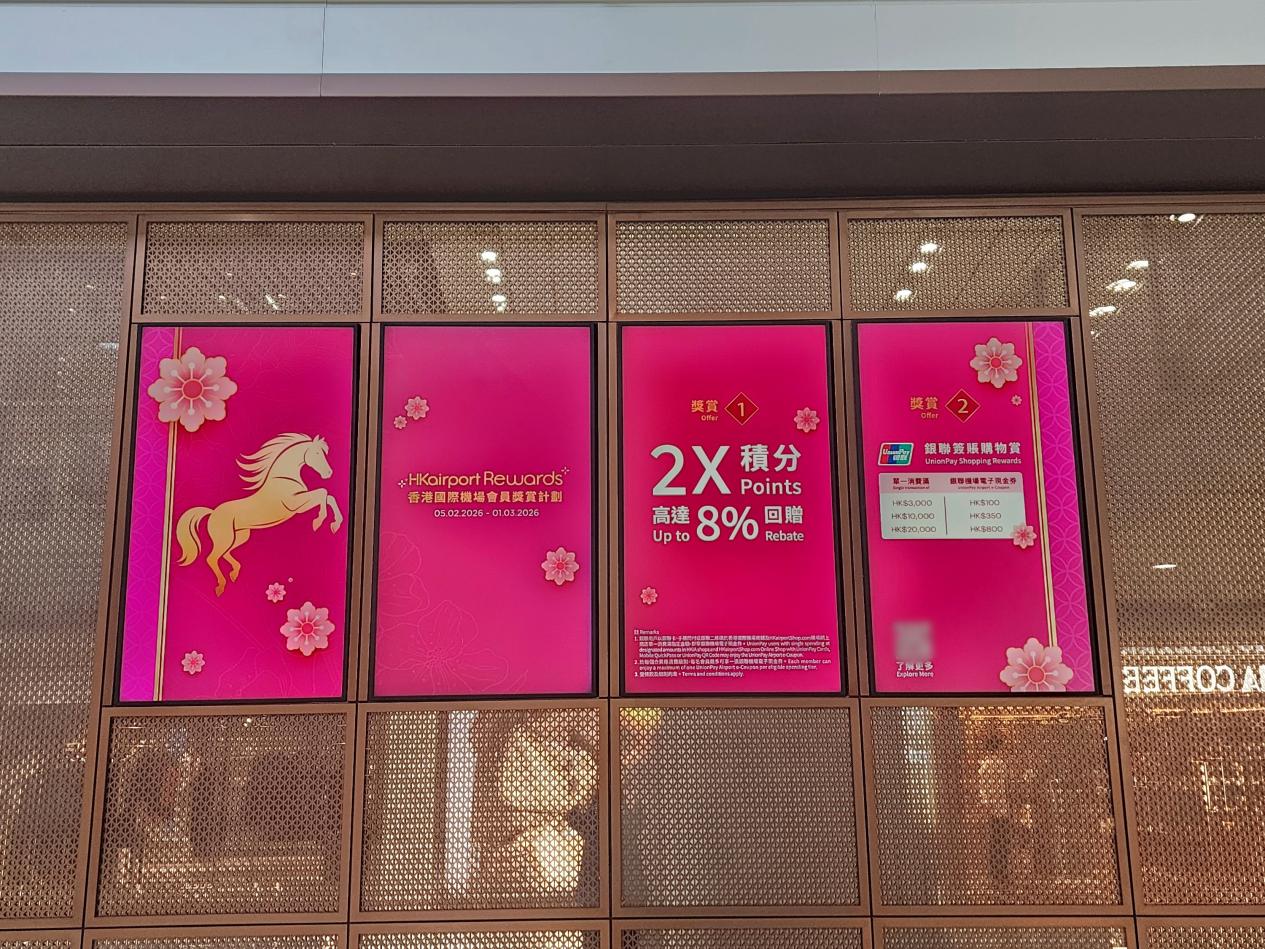 新春购物赏登场,马年限定会员活动更划算 新春期间,香港机场还推出了「新春购物赏」活动,为旅客带来更丰富的购物体验与实在回馈。即日至3月1日,HKairport Rewards会员可于机场店铺及机场网上商店尽享多重新春礼遇,让候机或抵港时的每一次消费,都更具价值。 活动期间,HKairport Rewards会员于机场店铺或机场网上商店消费可享受2X积分,每消费港币$1可获取2奖赏积分,等于每消费港币$25即可兑换$1 HKIA Dollar,并可当作港币$1使用。HKIA Dollar适用于机场内超过100家参与商户及餐厅,无论是选购新春好礼,还是打卡美食,都能灵活运用积分回馈。 除了丰厚积分奖励,本次活动还特别推出「金马迎春」加倍赏,集结20多家限时参与商户,带来超多专属优惠。经典手信、新春礼品、本地文创一站式逛齐,轻松解锁节日人气好物:奇华饼家精选产品低至85折、皇玥消费满港币$300即送价值港币$88的熊猫迷你精装礼盒,还有NUTTEA指定茶饮买一送一,候机就能一站式囤齐新春好礼。 同时,持银联信用卡的旅客,在推广期间于机场指定商户单笔消费满指定金额,还可叠加额外专属奖赏,每位旅客在活动期内每个消费层级仅可兑换一次: - 单笔消费港币$3,000–9,999 → 赠港币$100银联机场电子现金券 - 单笔消费港币$10,000–19,999 → 赠港币$350银联机场电子现金券 - 单笔消费港币$20,000及以上 → 赠港币$800银联机场电子现金券 高额消费也能享足回馈,新春购物性价比直接拉满。