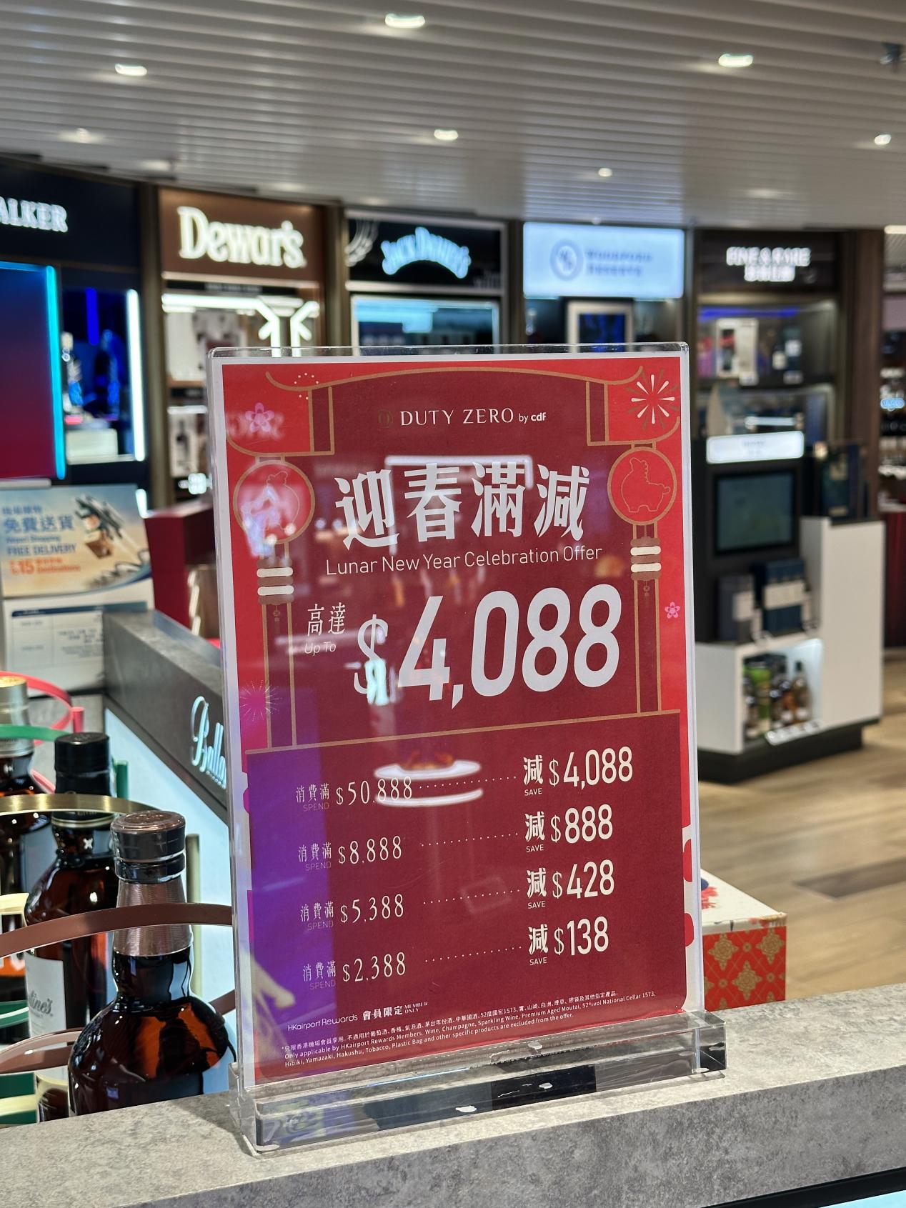 店铺还同步开启多档新春优惠,精选干邑与威士忌购买两瓶可享最高75折,葡萄酒、香槟及起泡酒享两件92折、三件85折,多买多省超划算。 HKairport Rewards会员还能解锁专属迎春满减,单笔消费满港币2,388减港币138、满港币5,388减港币428、满港币8,888减港币888、满港币50,888立减港币4,088。此外店内精选中国白酒购两支可享额外8折,部分指定产品更是低至半价,优惠多多。
