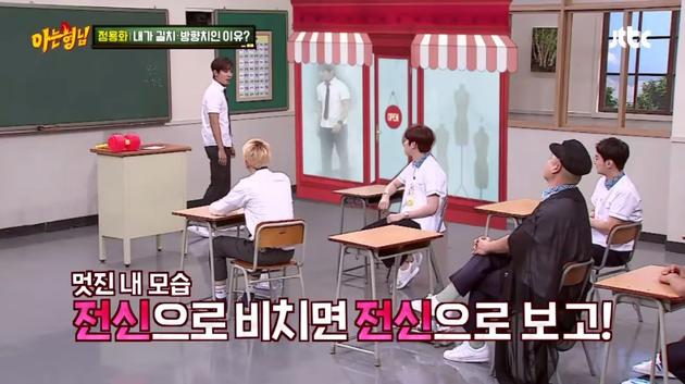 节目中,进行到“猜猜我”单元时,郑容和出题问“我是路痴、方向痴的原因是什么?”要主持群来作答,因为大家猜不出来,他主动给提示说“看到我有什么感觉?希澈、京勳和ZICO也会有同感的。”最后由希澈猜出来,正解是“在路上时,会看到玻璃出现自己的脸,所以常常看着那些地方走。”他也同感说,看到橱窗玻璃、车子后照镜会停下来照一下、拨弄一下头发。